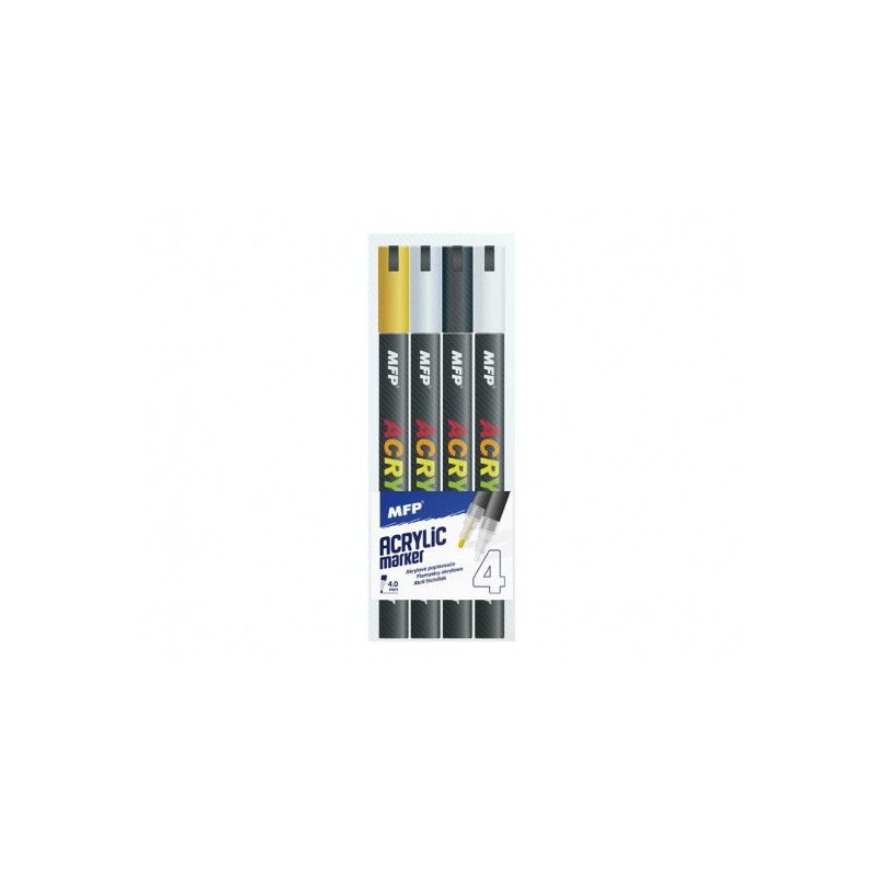 Akrylový popisovač, súprava 4 ks balených v plastovej krabičke. Tieto akrylové popisovače sa vyznačujú svojou farebnou sýtosťou a stálosťou, veľmi dobrými krycími schopnosťami. Sú vhodné na všetky nemastné a hladké povrchy, ako sú plátna, papier, drevo, kameň a iné.