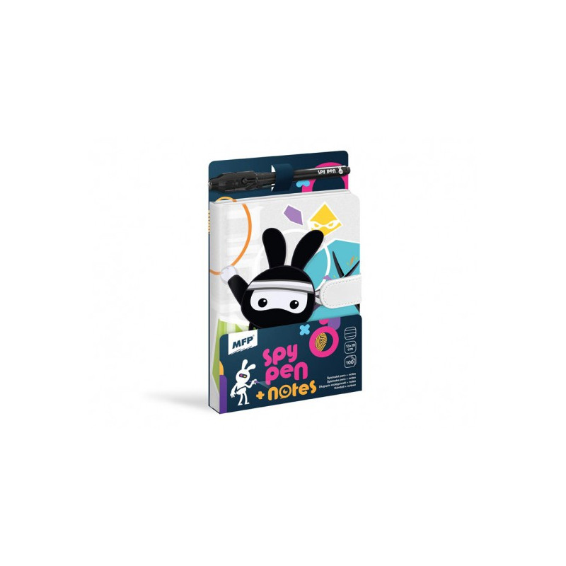 Linajkový poznámkový blok so zaoblenými rohmi. Blok má motív roztomilého čierneho ninja králika. Obsahuje špionážne pero s neviditeľným atramentom, ktorý je čitateľný len pod UV svetlom. Všetky dôverné informácie tak budú skryté. Pero v čiernej farbe je vybavené malým svetlom, vďaka ktorému je text viditeľný. Blok sa uzatvára pomocou magnetu.